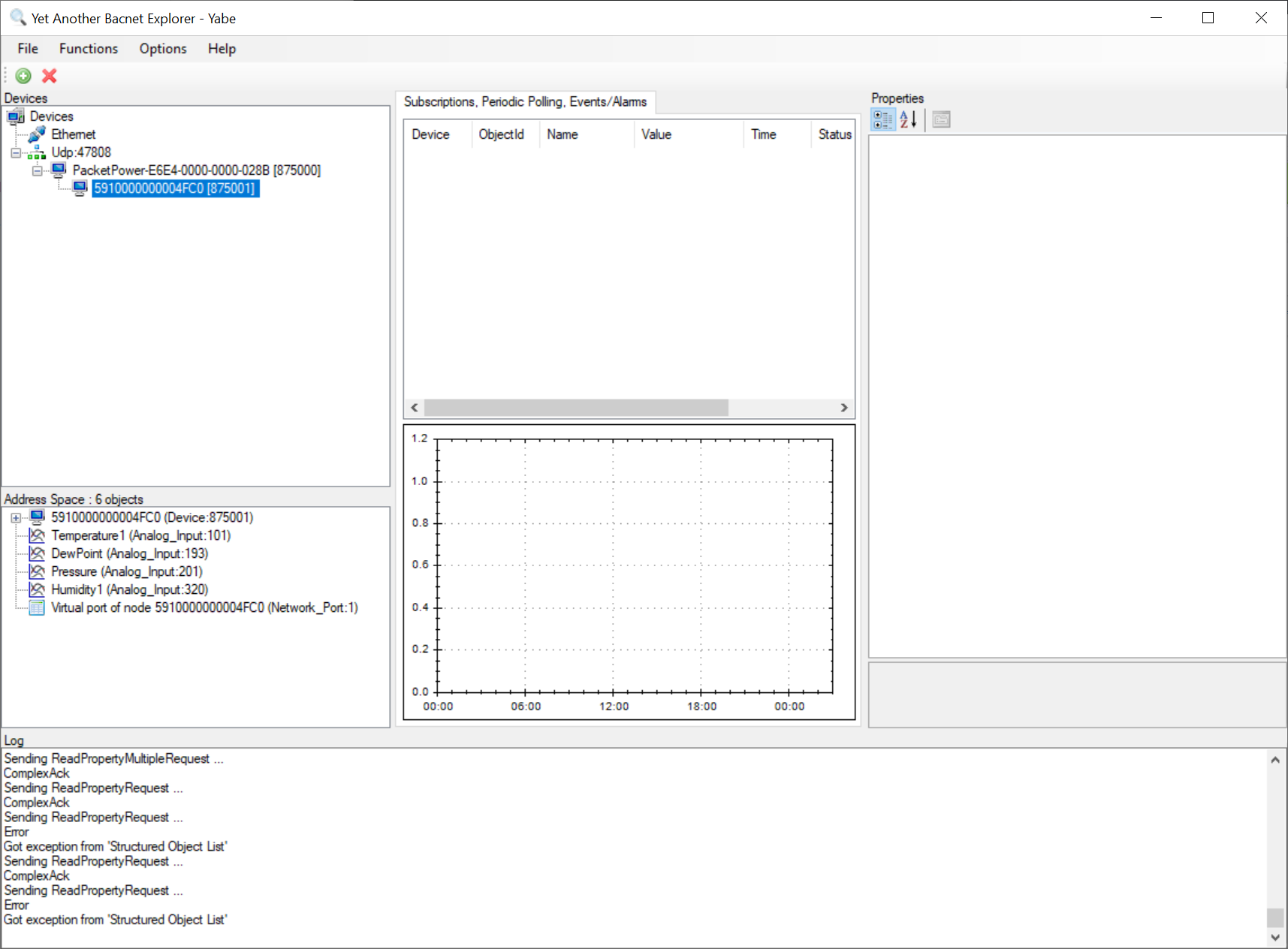 Install Yabe and issue a WhoIs request on the same network as the gateway. The gateway and the virtual device corresponding to the monitoring node should be detected. Click on the device to display all readings mapped for that device.