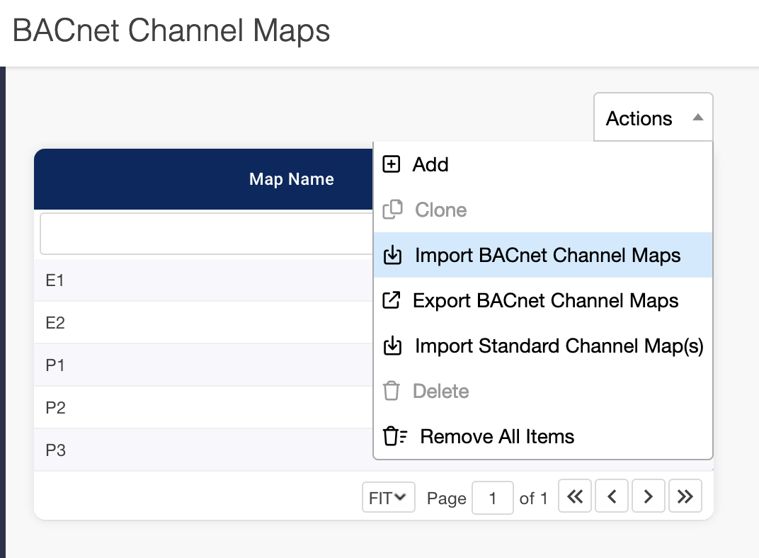 monitoring channels exposed for each node (the channel map). You can use one of the predefined channel maps or customize it as necessary. You can import the standard Channel Maps or your own using the Actions drop down.