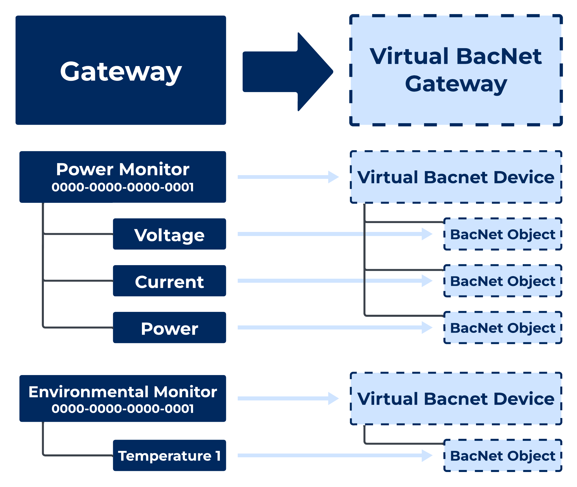 Selected monitoring nodes are exposed as virtual BACnet devices.