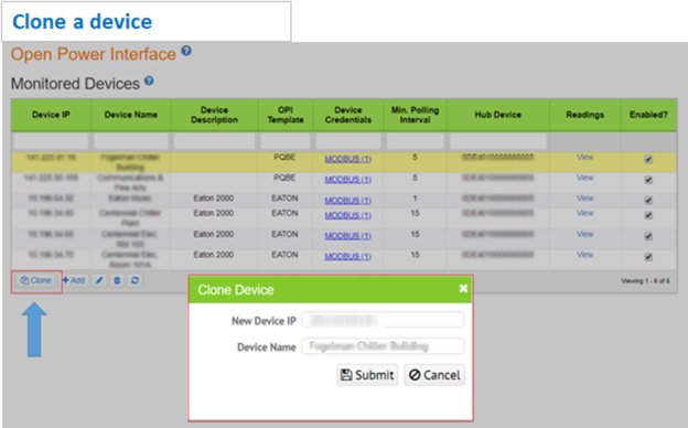 Once a device instance exists, adding like kind devices can be done quickly using the closing function. Once a device is cloned, it will need to be edited. and a unique device IP added.