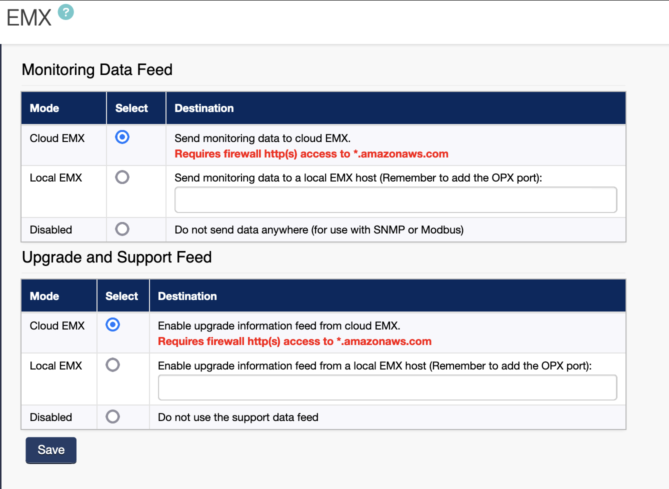 Select “Local EMX” in the “Monitoring Data Feed” and “Upgrade and Support Data Feed” sections