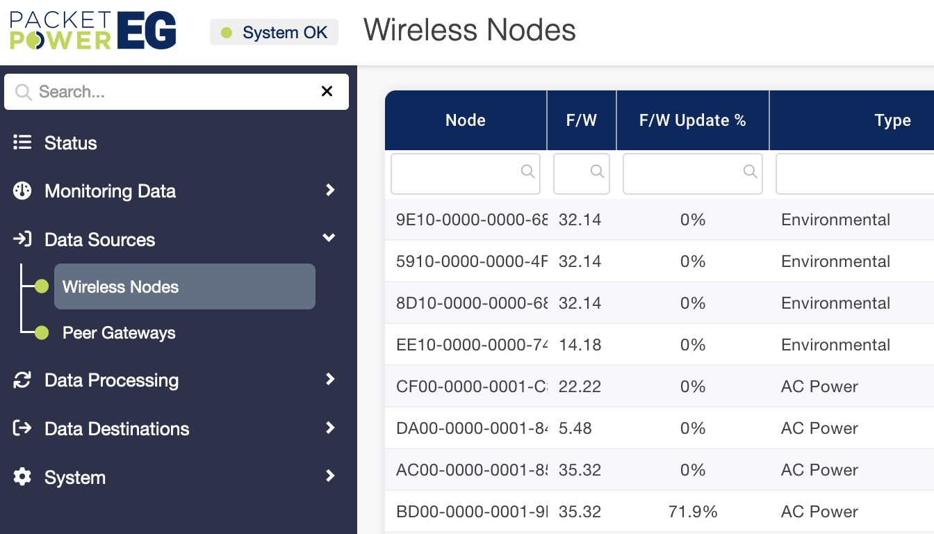 The Wireless Nodes sub-menu will expose all of the monitoring nodes in radio contact with the Gateway. Nodes may be segregated by "type" in the sub menu i.e. "power" or "environmental monitors". To search for a specific node, input the node ID in part or full in the "Node" column. The data table for nodes is explained below: