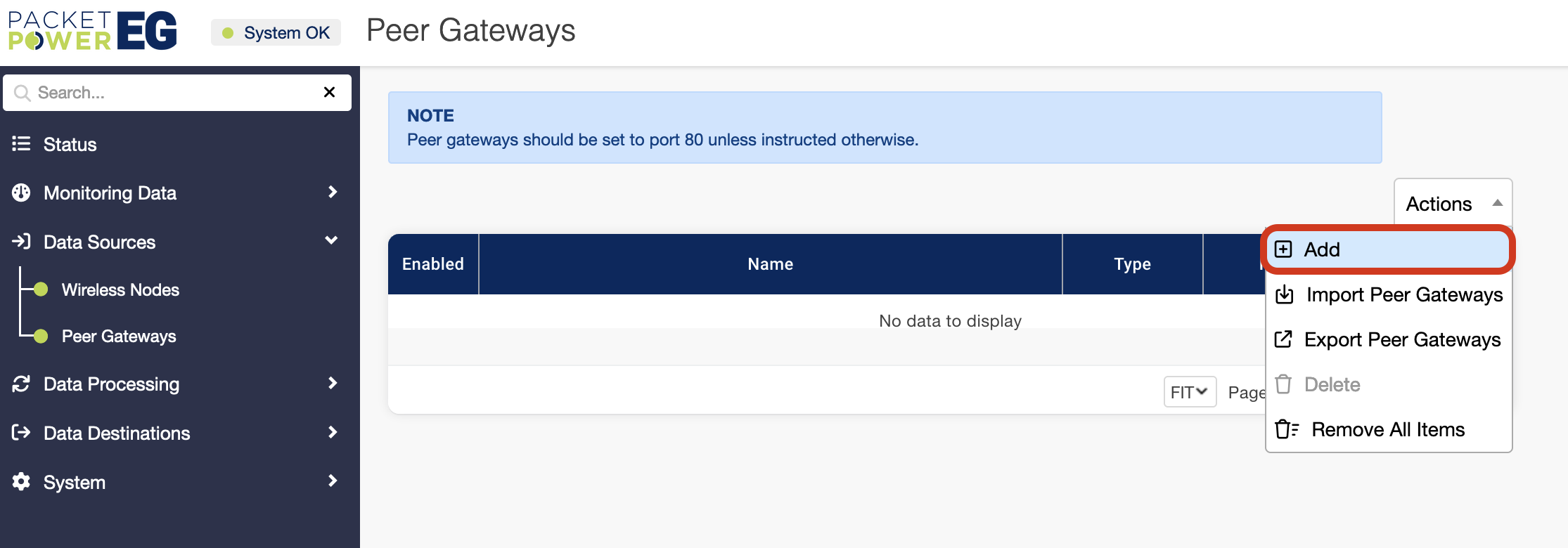 Select the “Peer Gateways” tab under the “Data Sources” tab on the left menu