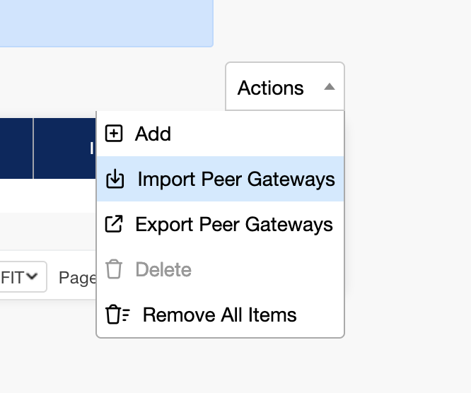 For larger networks that contain a large volume of Gateways, peering data can be exported and saved as well as re-imported. This makes it easy to load peering data onto many Gateways without manual data entry. To import or export peering data, click on the import or export options under the actions drop down and follow the steps listed above. Note that data will be stored on a JSON file.