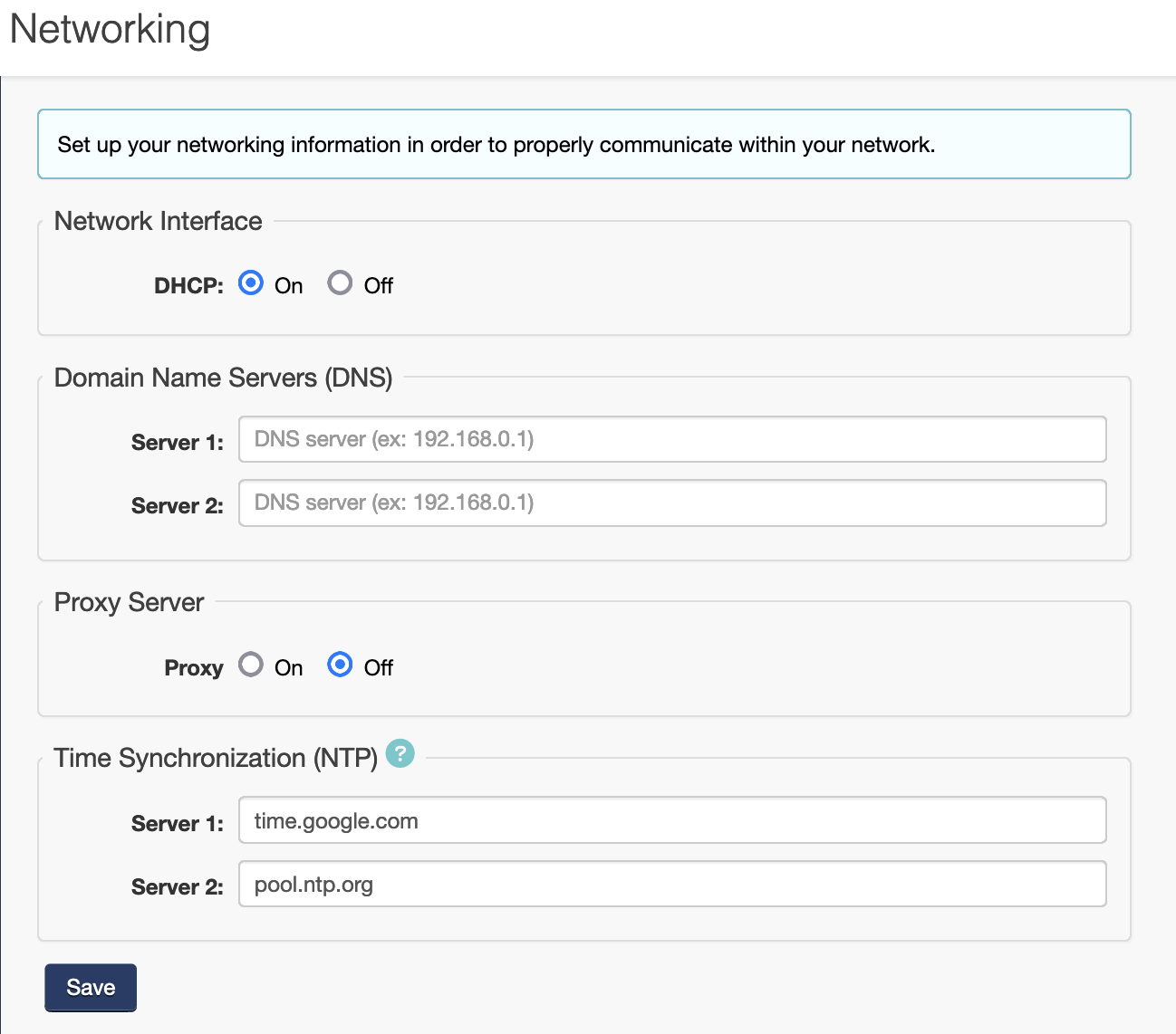 The Networking tab allows for the input of network settings. See the Network Configuration section for a detailed explanation.