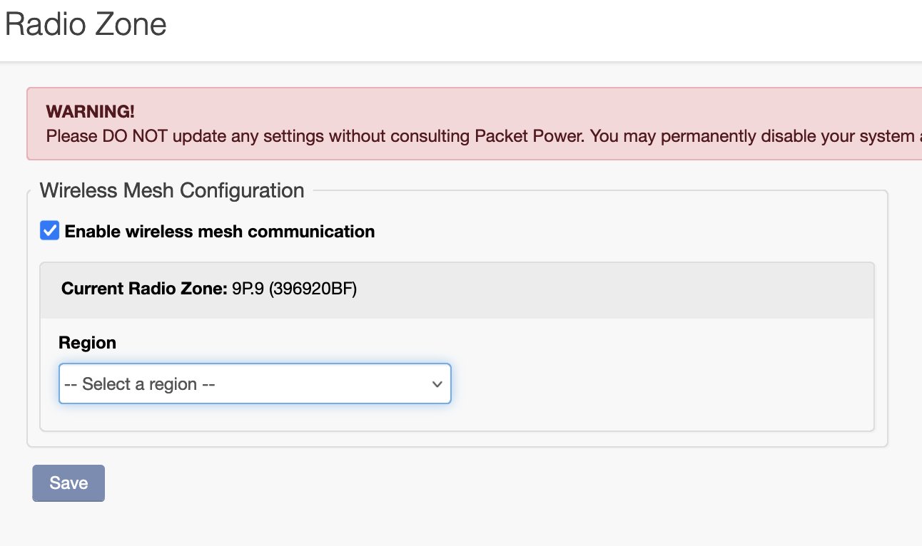 WARNING: DO NOT update any Radio Zone settings without consulting Packet Power. You may permanently disable your system and/or violate local radio communication licenses!