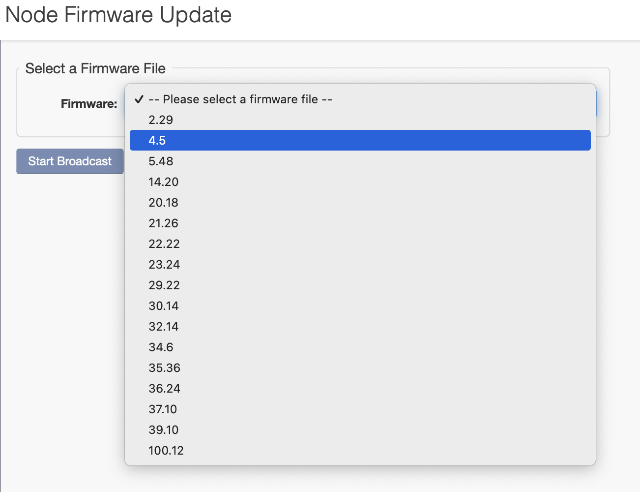Note that different monitoring node types use different firmware images. In a firmware version designation, the first number (e.g. "5" in 5.28) denotes node type and the second number (i.e. "28") indicates the firmware version. Nodes of a given type will only receive firmware images of the matching type. If multiple firmware images need to be upgraded (e.g. upgrading 5.28 to 5.29 and 23.12 to 23.14), upgrades have to be done sequentially (initiate one upgrade, wait for it to complete, then initiate the next upgrade).
