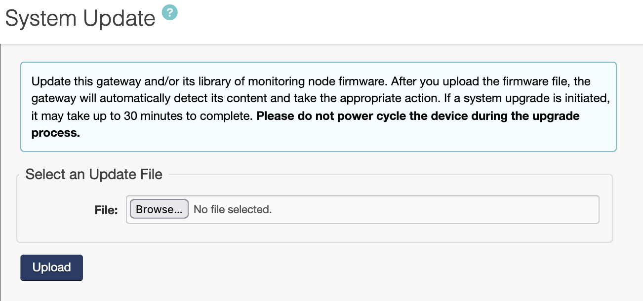 The System Update feature provides the latest Gateway firmware along with an updated library of monitoring node firmware. After the firmware file is uploaded, the Gateway will automatically detect its content and automatically integrate the new firmware.