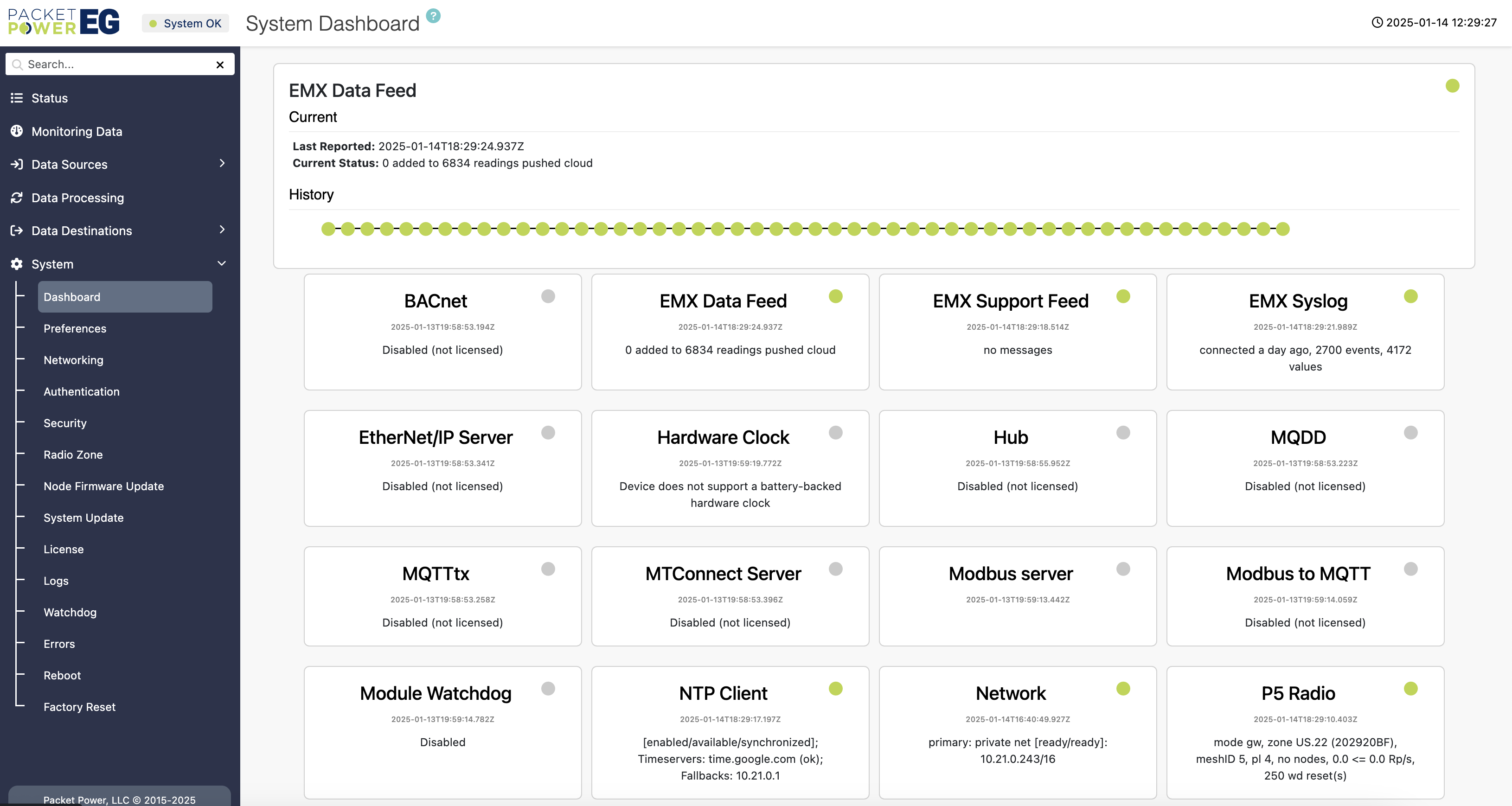 The Dashboard feature serves as a diagnostic tool for Packet Power and its authorized partners. Note that it may not be available on all Gateways. To view a status history timeline and additional details, click on a card, and the information will appear at the top of your screen. The current status of each card is indicated by the colored circle in the top-right corner.