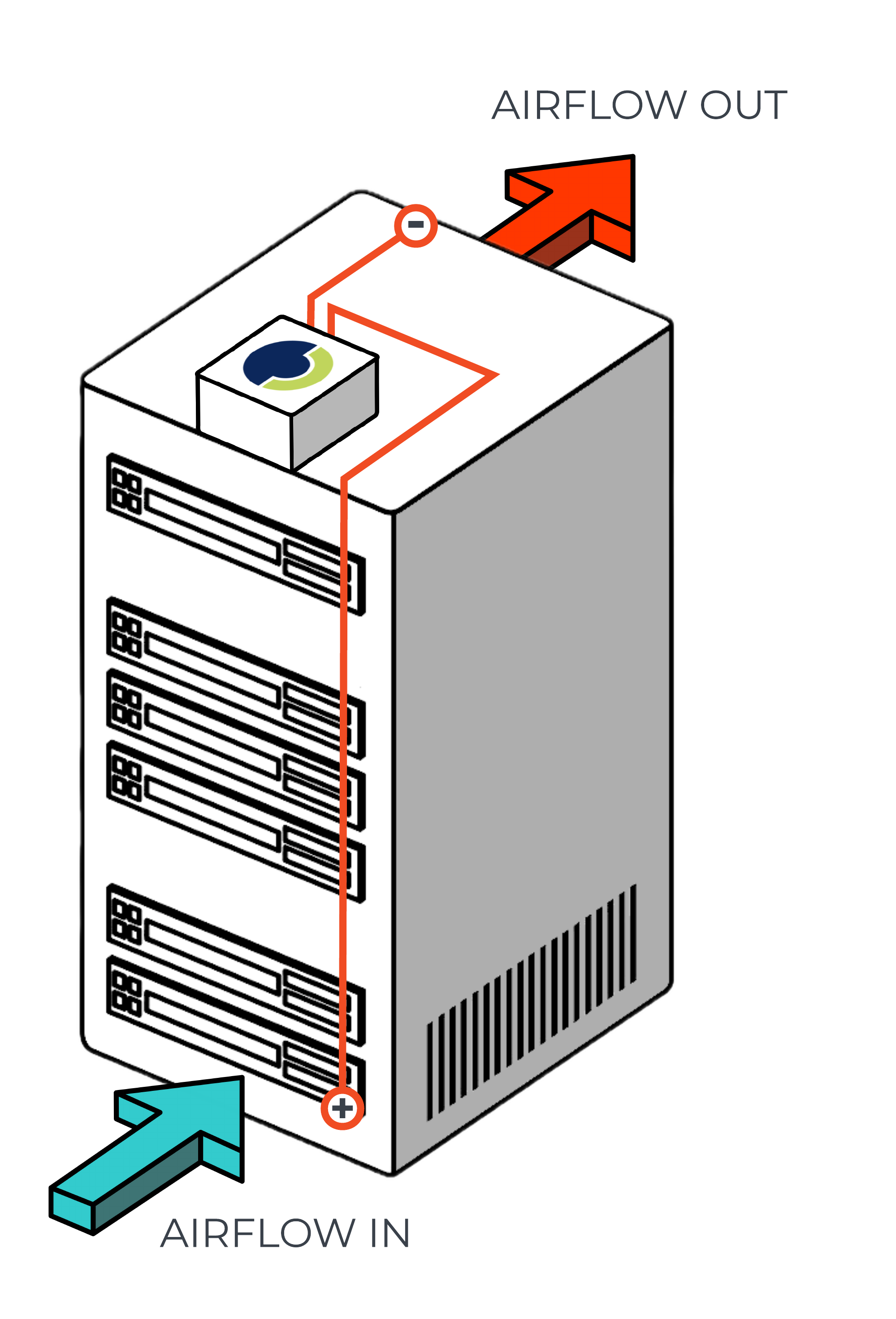 By placing one tube in direct path of the flow (i.e. at the base of a server cabinet by the air intake) and the second tube in the ambient area with little air flow (i.e. the top exterior of the server cabinet), the resulting pressure differential will reflect the level of air flow. Note: This is not a measurement of specific air flow rate, but rather a relative indication. A lower differential pressure will indicate a lower air flow rate, and a higher pressure value a higher flow rate.