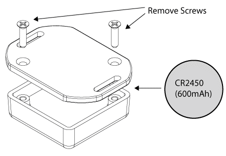 The lithium coin cell battery can be replaced by removing the two screws on the back of the module. It is recommended that the battery be replaced with a Panasonic CR2450 lithium coin cell or equivalent capacity (600 mAh) cell to ensure the stated battery life.