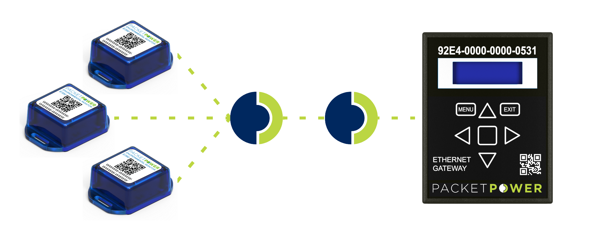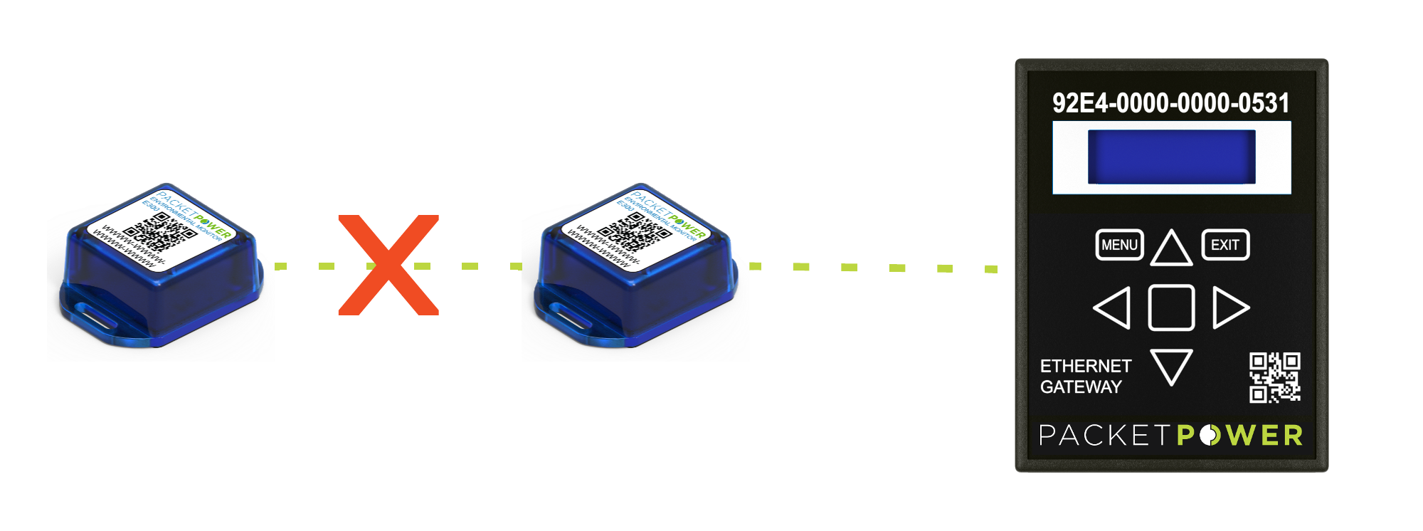 Must be placed indoors within 10 to 30 meters of a Gateway or an AC powered Packet Power monitor that has access to the Gateway either directly or relayed through other AC (line / mains) powered monitors. AC powered monitors have the ability to relay the signal from a battery powered monitor to the Gateway directly or indirectly through other AC powered monitors. Battery powered monitors do not have the ability to relay the signal.