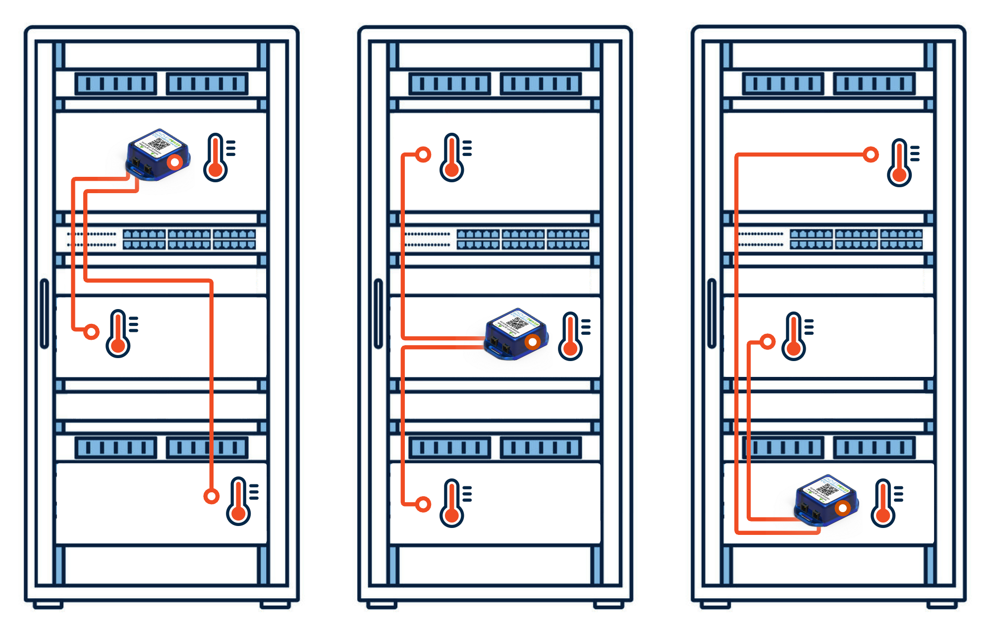 Monitors can be located inside computer server racks with perforated or plastic fronts.