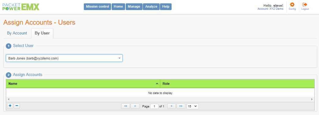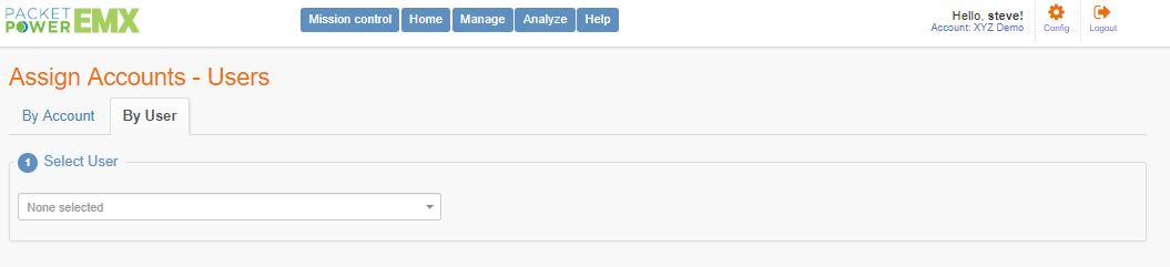 To assign a user to an account, you can either choose the account then add the user(s), or choose a user and add account(s). Outlined below is the process of assigning By User.
