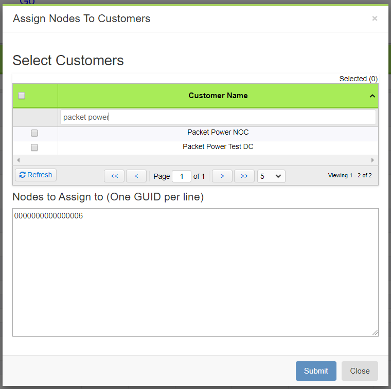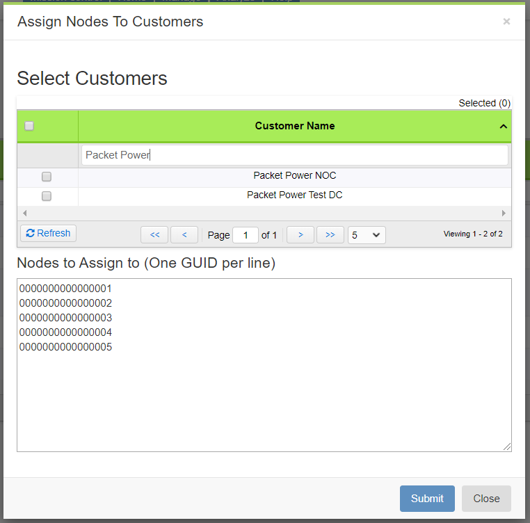 From the main Edit Nodes screen, choose Assign Nodes to Customers from the Select an action... drop down and click Go.