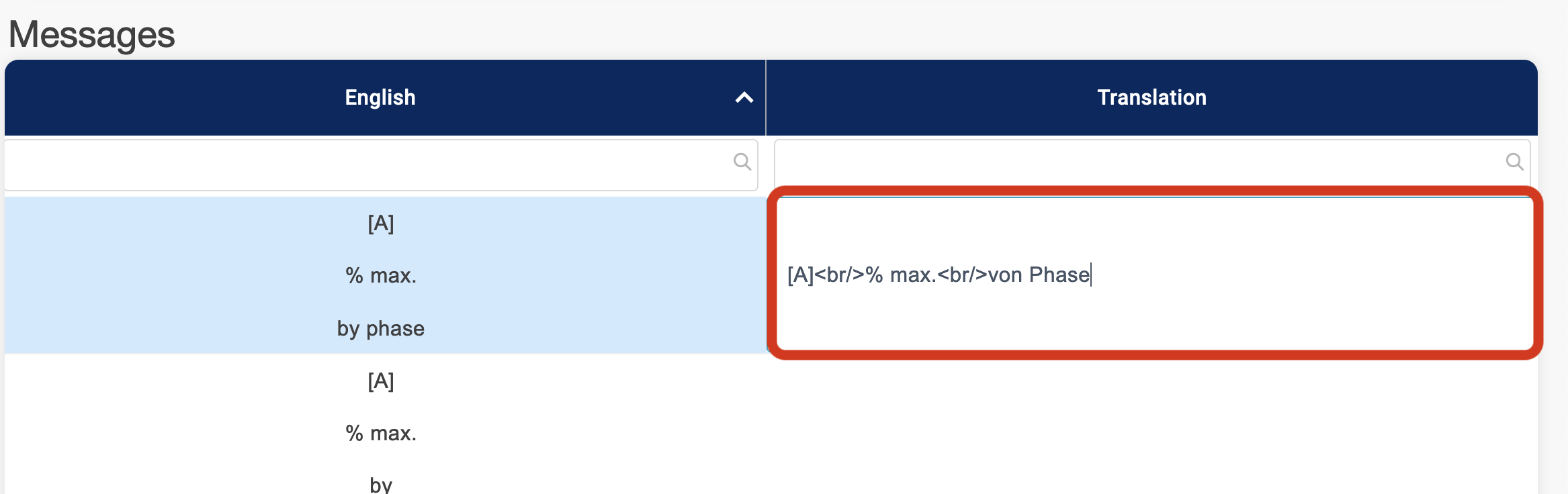 You can also edit elements by scrolling to the messages section and selecting a corresponding translation cell.