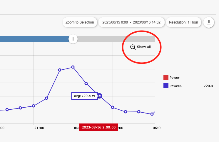 Hold your cursor over a spot in the graph to view an exact measure of power for that particular date and time.