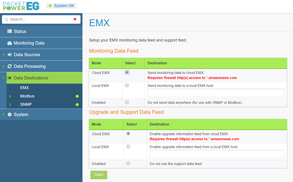 Select “Local EMX” in the “Monitoring Data Feed” and “Upgrade and Support Data Feed” sections