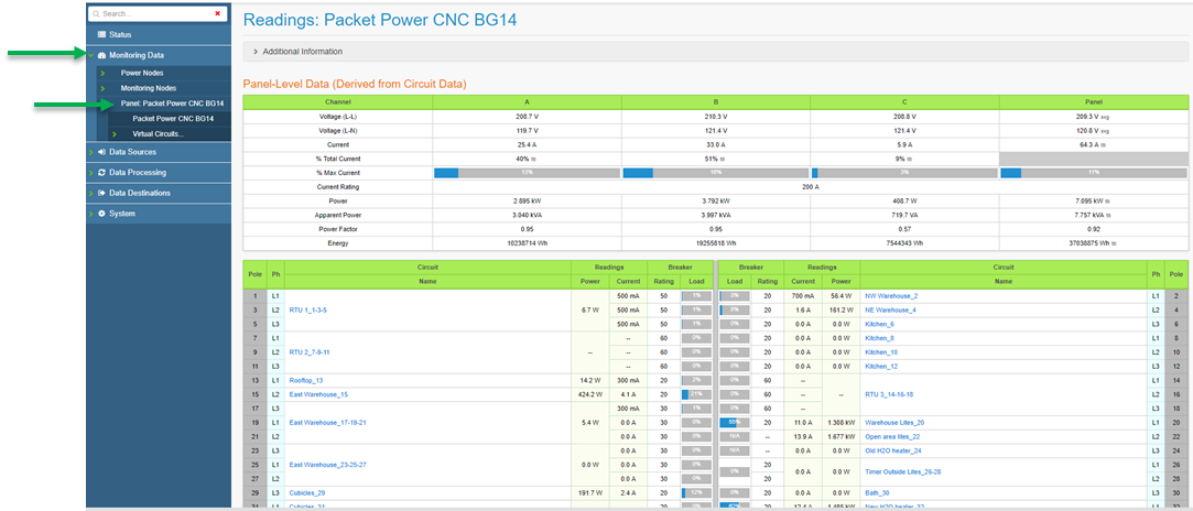 This is what a completed panel with data looks like in the Gateway's Monitoring Data section. The Virtual Panel feature allows Packet Power reading data to be displayed according to its actual circuit breaker allocation. Go to View Panel Data in Gateway to learn more.