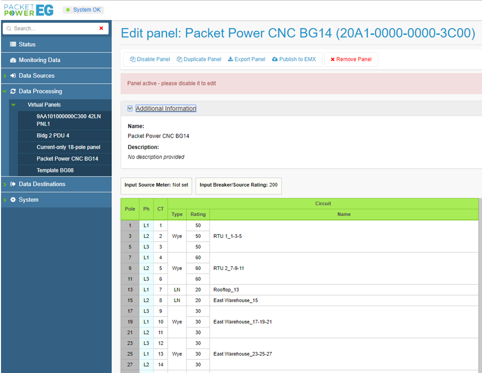 The “Virtual Panel” application for branch circuit panelboards and other multi-circuit devices makes it possible to configure EMX and Modbus registers to match the circuit mix in your panel. This means that each circuit breaker will be depicted as a one-, two- or three-pole circuit along with its pole location(s). This intuitive depiction makes it easier to identify circuits and their associated power usage in. This is a licensed feature that is only enabled on authorized Gateways. For details contact sales@packetpower.com.