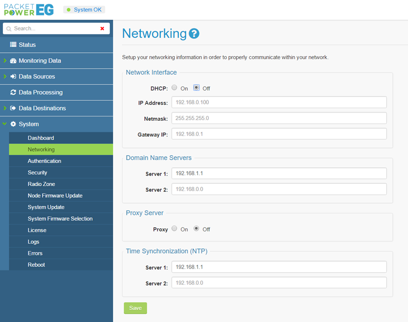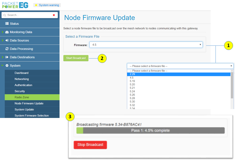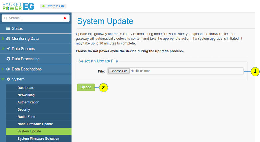 The System Update feature provides the latest Gateway firmware along with an updated library of monitoring node firmware. After the firmware file is uploaded, the Gateway will automatically detect its content and automatically integrate the new firmware.