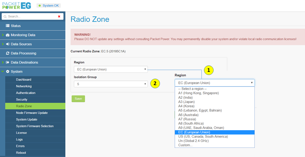 Packet Power Gateways and monitors are capable of transmitting on both the 900 MHz and 2.4 GHz bands in the ISM spectrum along with segregated channels within these bandwidths. Depending on geographic region or country there are specific bandwidths required. This is defined by the “Region” (1) setting in the Radio Zone configuration.