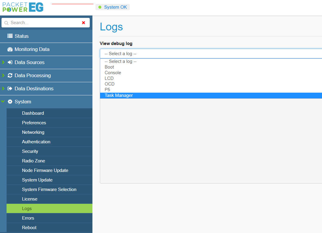 Select the log to be accessed under the "View debug log" menu. The log file will then appear in the dialog box where it can be copied and pasted as required. Note that there are seven unique logs: Boot, Console, LCD, OCD, P5, Task Manager, and NTP Client.
