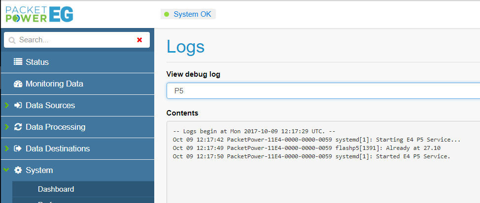Logs provide critical operational details relating to the Gateway operation. They are retrieved for debugging purposes and used strictly by Packet Power engineers.