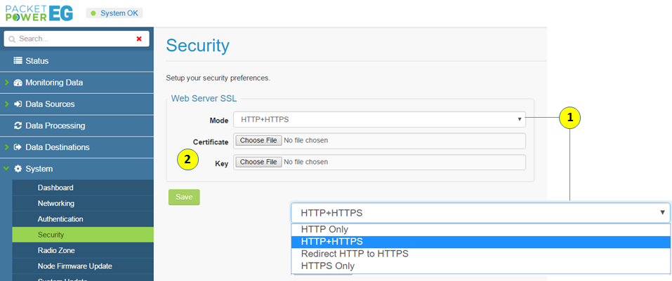 The default exchange protocol is HTTP + HTTPS. This can be upgraded to an SSL protocol using one of the three other optional settings by selecting from the “Mode” drop-down menu (1)