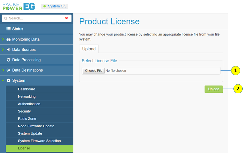 Select the license file by clicking on the “chose file” button under “Select License File” (1)