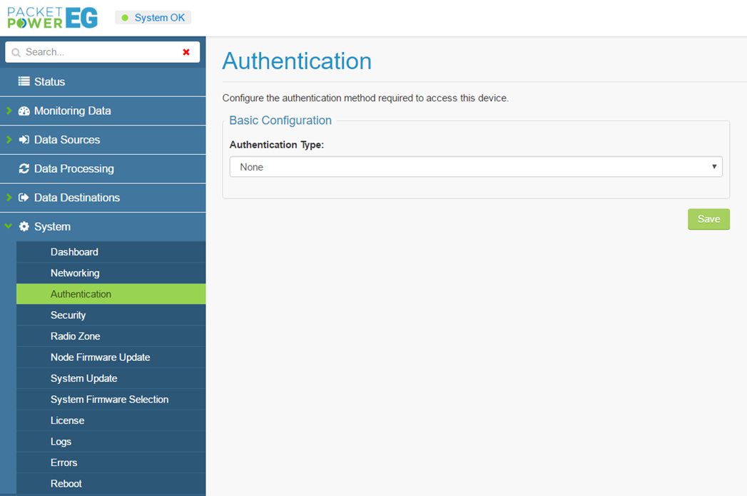 Configure your desired method of authenticating user access to the Gateway. Multiple options exist including "None" and "Local Account". To set up local users for access see Adding Authentication