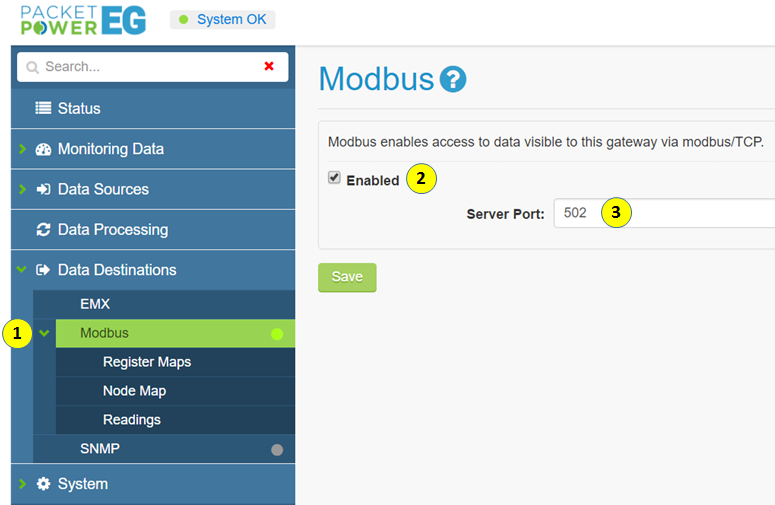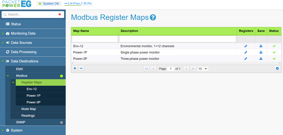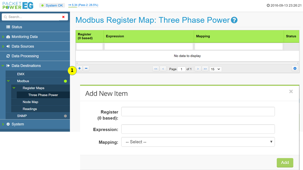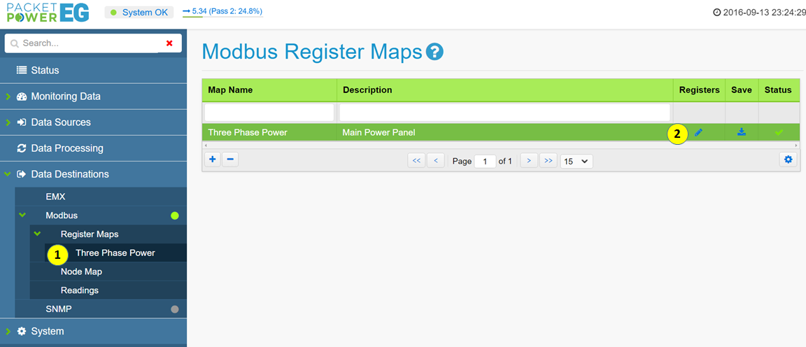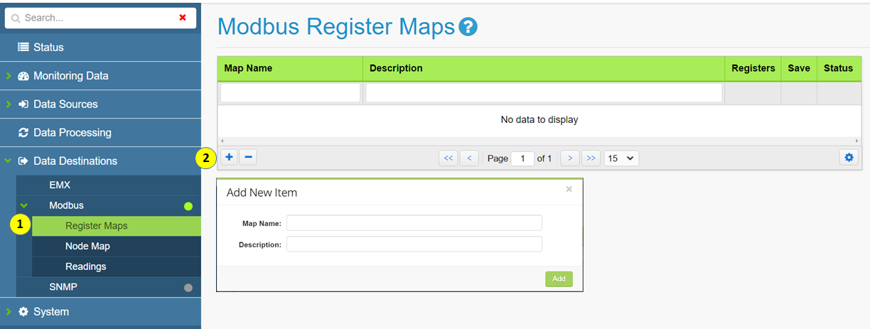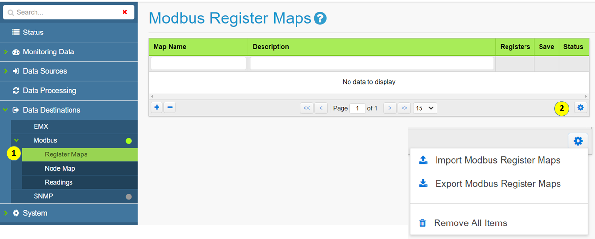 Select the “Register Maps” tab from the menu under Data Destinations > Modbus