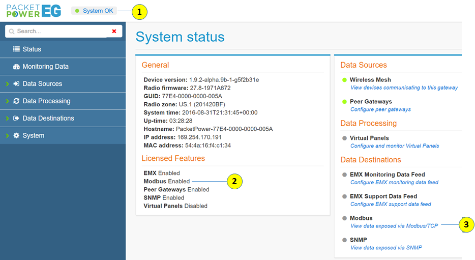 The Ethernet Gateway Modbus interface makes all monitoring data received from Packet Power's wireless monitoring network accessible via standard Modbus TCP/IP protocol via the Ethernet port of the Gateway. The Gateway is capable of providing a Modbus data output and simultaneously serving data to EMX portal. This allows users to take advantage of the EMX portals features while also serving data to the third party monitoring system.