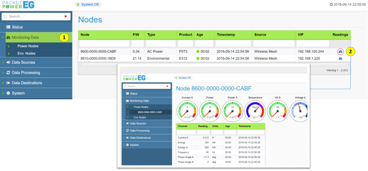 To access specific readings for each node click on the “readings” icon (2) to expose the real time readings
