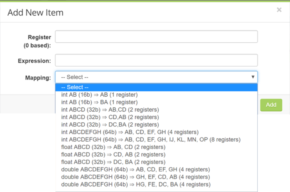 To add individual registers to a register map select the “+” icon (1) from the Register Map