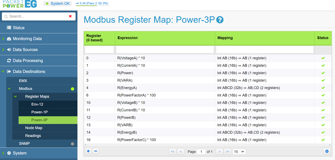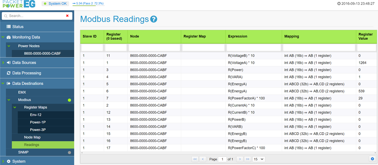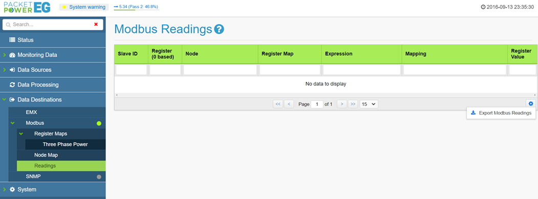 Select the “Readings” tab under Data Destinations>Modbus>Register Maps>Readings.