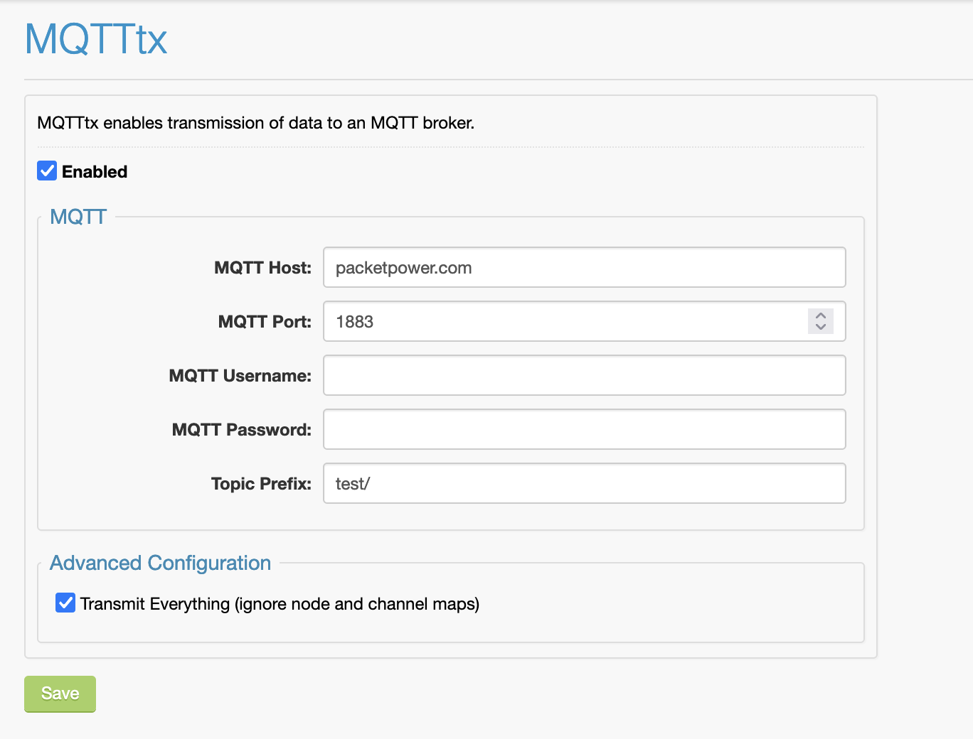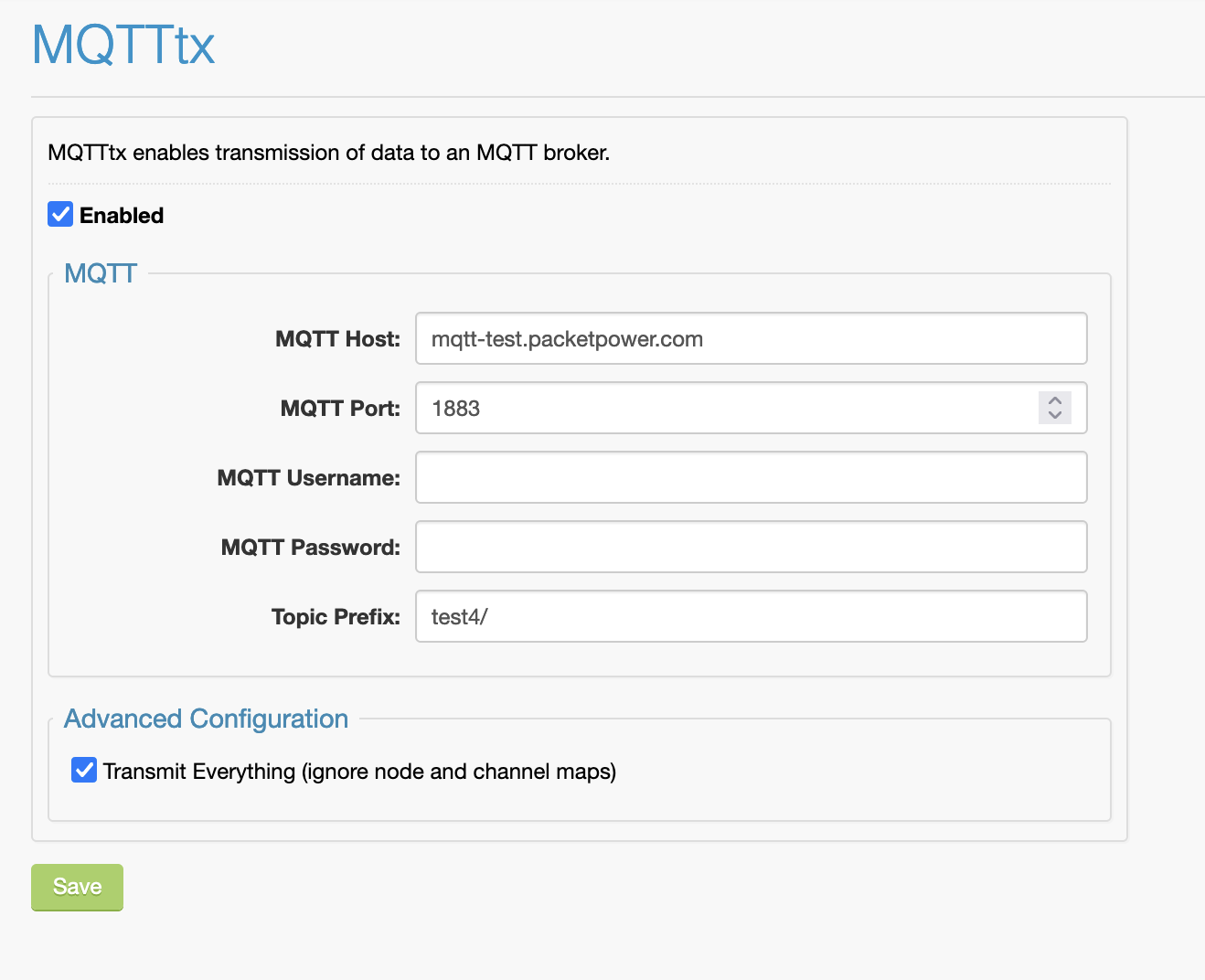 The gateway can publish messages to specific topics using MQTT. This includes the message payload and the topic to which the message should be sent. If you want custom prefixes in addition to your node readings, enter them in the prefix area and they will show up before each node topic.