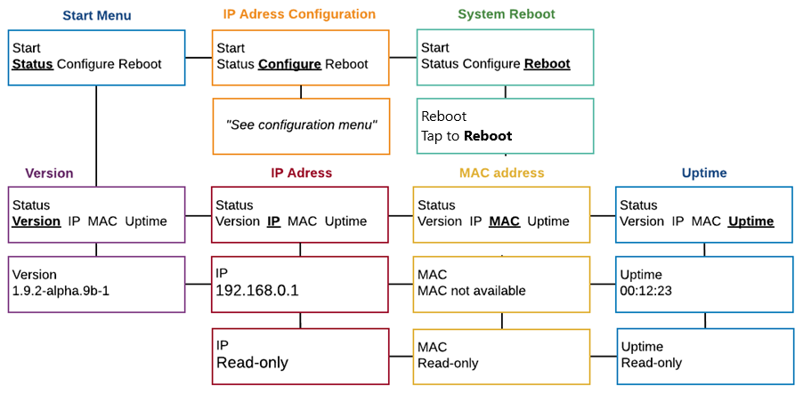 After the Gateway is energized and completes its boot sequence (approximately 30-60 seconds), the Network Status menu will appear. This will reveal details about the Gateway's version, IP address (if previously programmed), MAC address, and Uptime (duration since last energization).