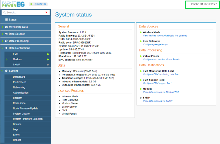 In order for the Gateway to have a proper time reference, a NTP server address is needed in the Time Synchronization Section. The default time servers are 0.pool.ntp.org and 1.pool.ntp.org. Once a time server is entered confirm the time at the top right of console. For more information on available NTP servers see the NTP server section. The time will be expressed in the top right corner of the Console screen.
