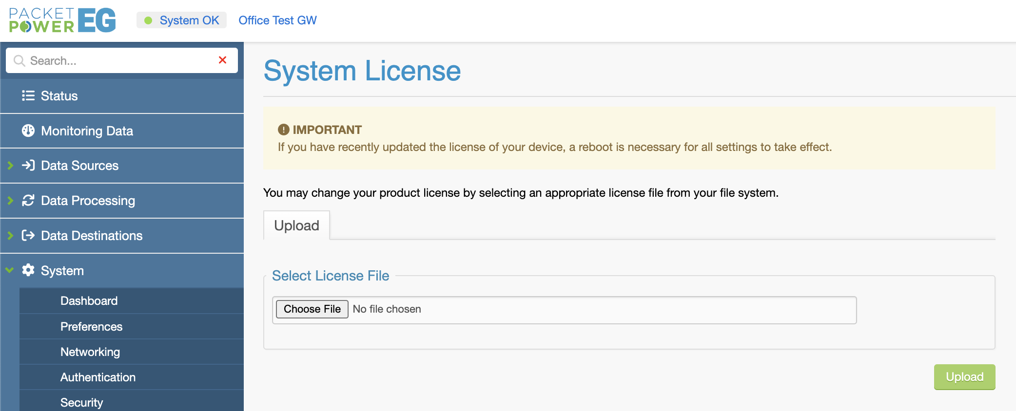 Navigate to the reboot page via the navigation menu and select reboot to finish applying the new license.