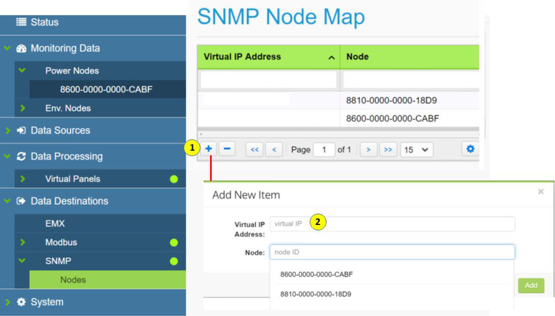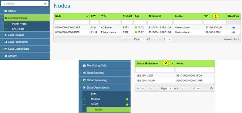 To apply a Virtual IP address to a specific node open the Gateway Console and select “SNMP” under the “Data Destinations” menu, then select the “Nodes” menu. This will expose all of the nodes for the Gateway