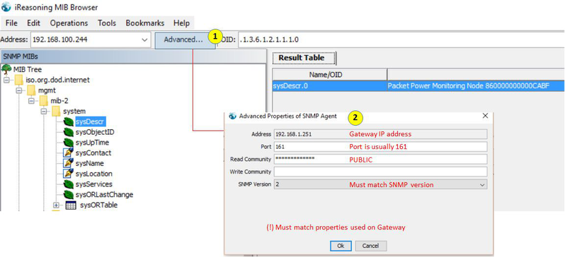 Note that after a new IP address is entered it may be necessary to (1) click on the “Advanced” tab and (2) re-enter the properties of the SNMP agent for each unique IP address.