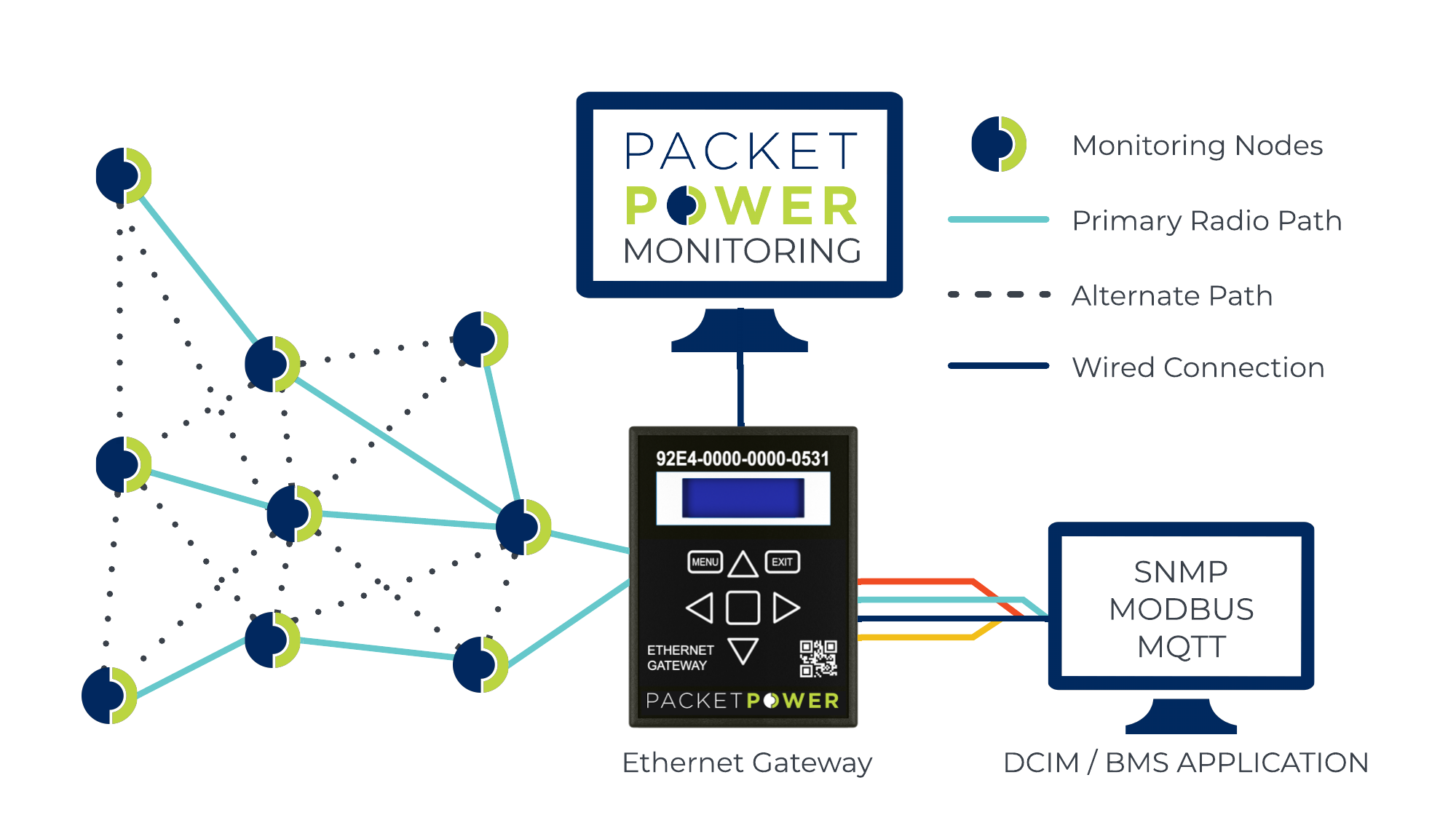 Packet Power Gateways collect data from Packet Power wireless monitoring nodes and aggregate the data for transmission by MQTT, SNMP, Modbus TCP/IP and directly to the Packet Power EMX monitoring portal. Note that the Gateway can support transmission of data via MQTT, SNMP or Modbus TCP/IP while simultaneously serving data to the EMX portal.