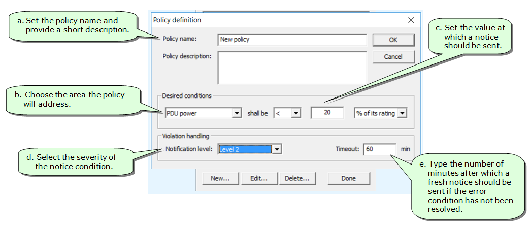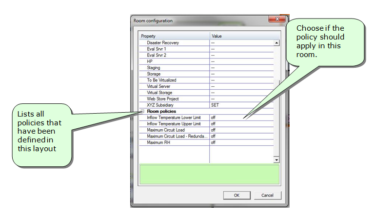 Policies are used to define monitoring rules that you wish to use in many places. A policy is defined once and can be applied at the room or cabinet levels.