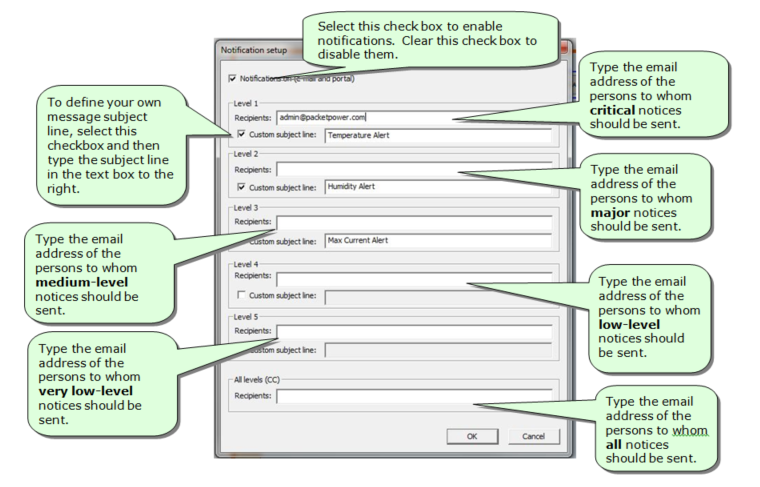 2. Click on Set up in the Notifications area in the Power Manager ribbon. The system will display the Notifications setup dialog box.