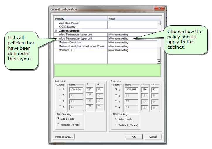 Once you have defined a policy, it is available to be used in any room or cabinet within a layout. If you apply a policy at the room level, it will be in effect on all cabinets and devices within that room. Note, you have the option to exempt specific cabinets from a room-level policy (see Apply at the Cabinet level for instructions).