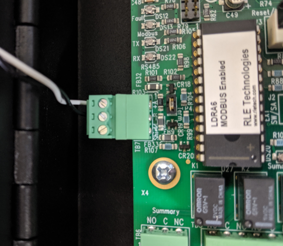 Connect the Modbus RTU twisted-pair cable to the RLE device using the screw terminals. Terminals are typically labeled with a "+" (plus sign) or "A" on one connection and a "-" (minus sign) or "B" on the other connection. Refer to the RLE device user guide for details on wiring for RS-485 serial communications.
