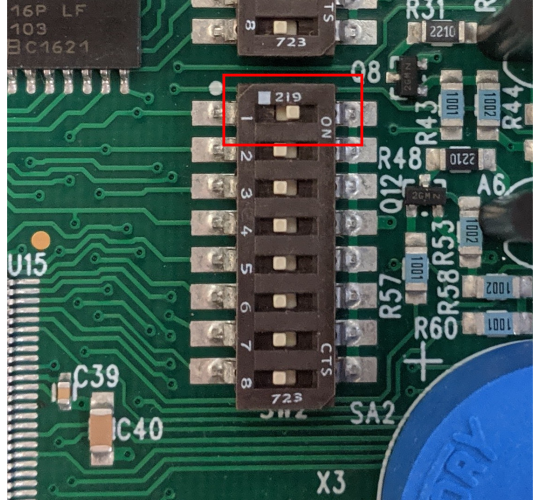 Use the DIP switches on the circuit board labeled SW2 to set the device address to 1. This requires setting the bit labeled "1" to "ON", with the seven remaining bits set to "OFF".